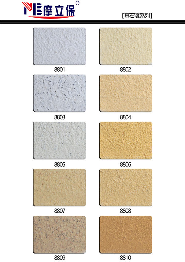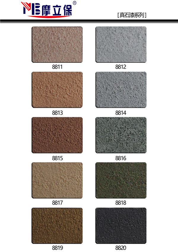 摩立保真石漆以高耐候有機硅改性丙烯酸乳液和天然彩砂為主要原料精制而成,具有天然真實的自然色澤,給人以高雅、和諧、莊重之美感。適合于各類建筑物的室內外裝,特別是在曲面建筑物上裝飾,可以做到生動逼真,回歸自然的功效。